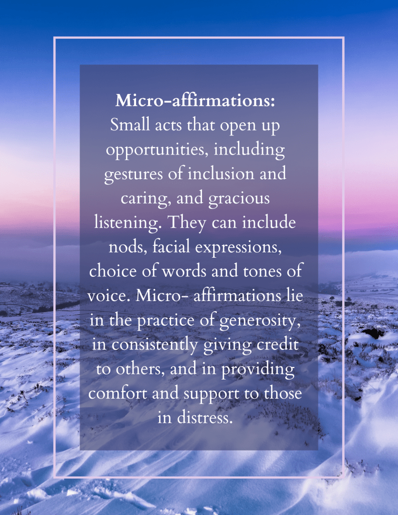 Today, I learned a new term in my workplace’s course on Harassment and Violence in the Work Place. It really made me stop and take a moment to breathe it in. It made me wonder, how different would my inner life be if I only ever gave myself micro-affirmations? Or if I made it my intention each day to lead with micro-affirmations for myself, for my family, for my colleagues and for everyone I interact with?